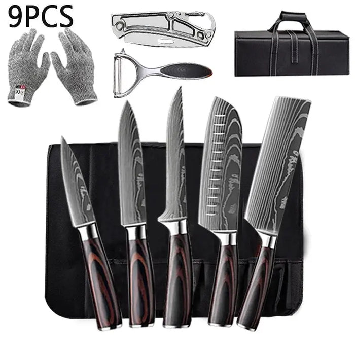 - Composition : L'ensemble comprend un couteau de chef, un couteau à trancher, un couteau utilitaire, un couteau à légumes et un couteau à pain, répondant à tous vos besoins culinaires.