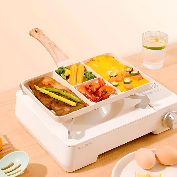 Notre grande poele rectangulaire large de 35 x 27 cm est conçue avec quatre compartiments, vous permettant de préparer une multitude de plats en même temps. Imaginez cuisiner un steak juteux, une omelette avec ciboulette et des légumes sautés, le tout dans un seul ustensile de cuisine !