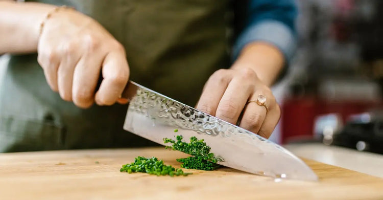 • Couteau japonais Santoku : large lame japonaise alvéolée, parfait pour hacher et trancher finement.
